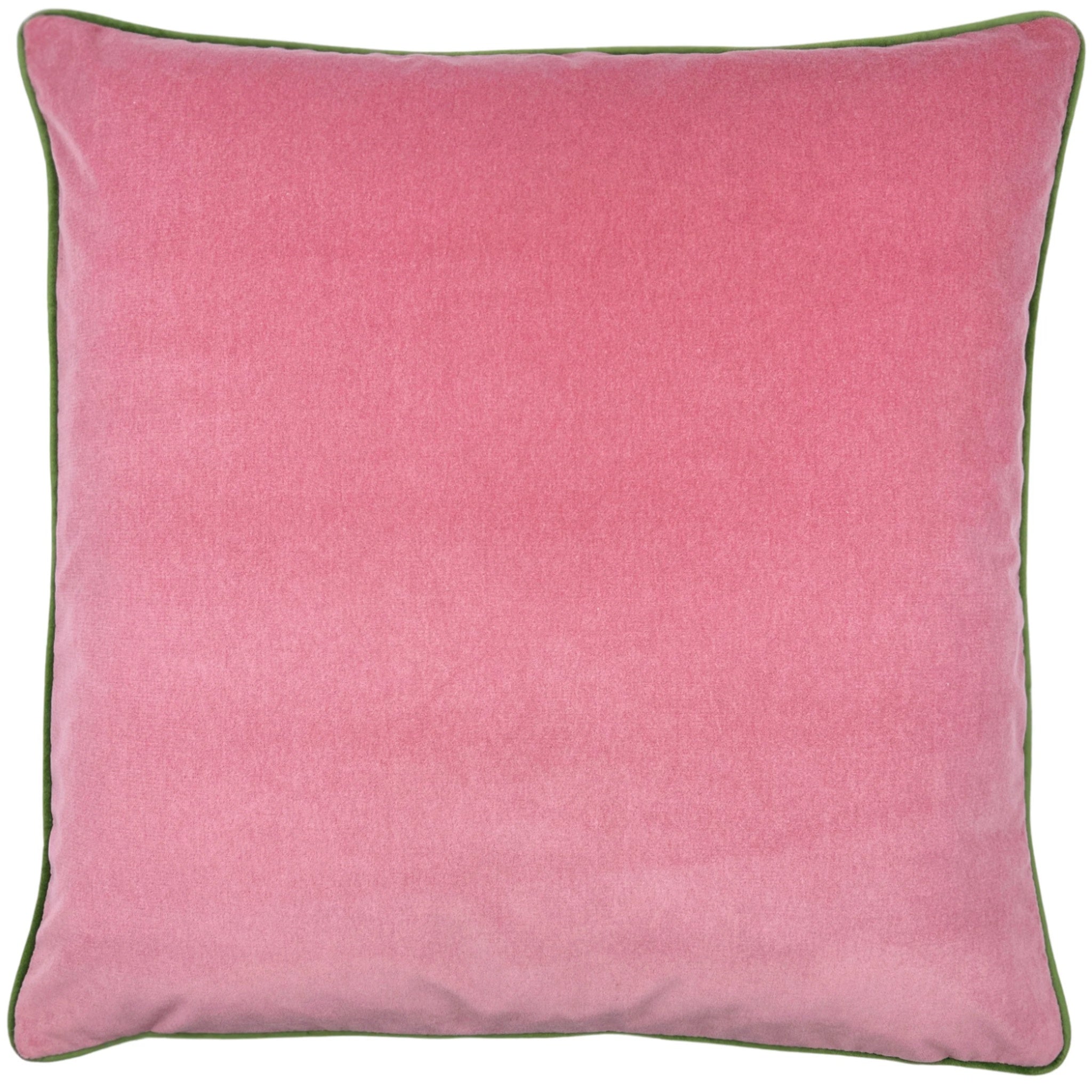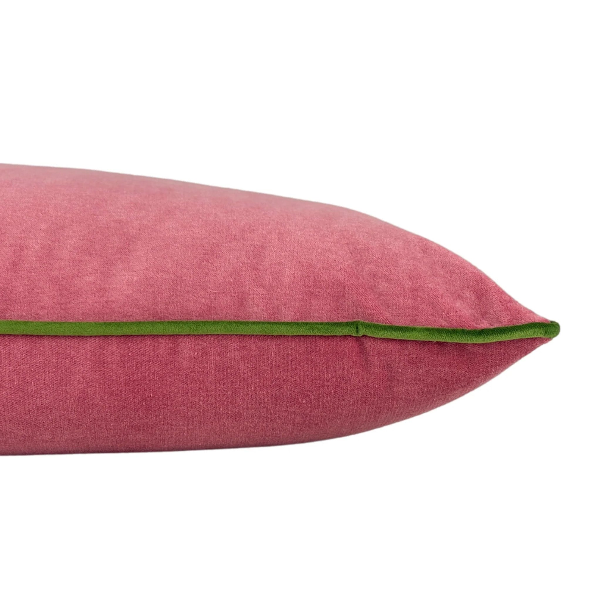 Elevate your home with the classically elegant Libby. This luxurious solid dusty rose velvet pillow features a lima green velvet cording, adding a touch of sophistication to any space. With an identical front and back, this pillow will look good from any angle.
